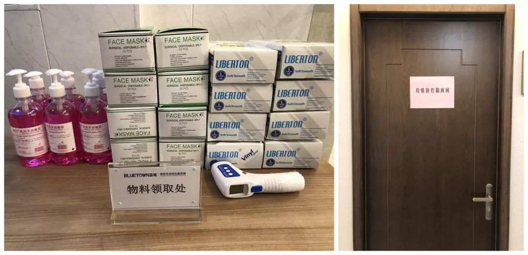 落实专门疫情防控管控人员,设立物料领取处和临时隔离室,配备防护口罩、消毒液、额温枪、无菌手套等疫情防控用品,确保防护物资充。