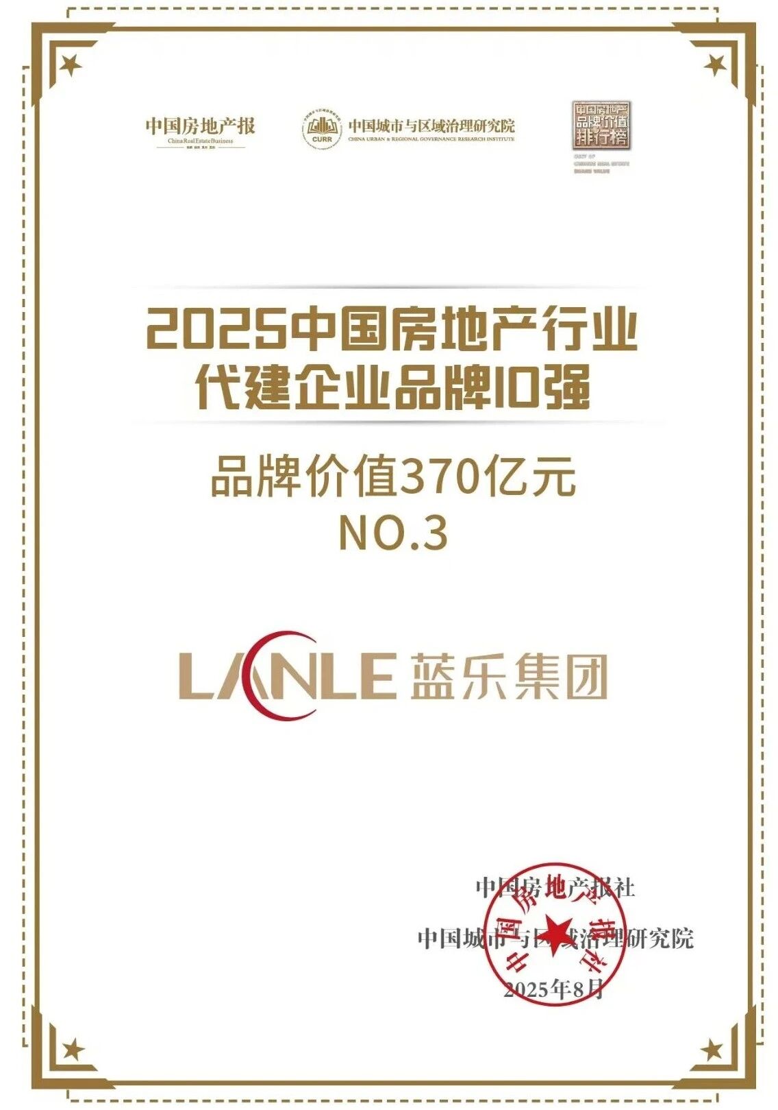 8月19日,由中国房地产报、中国城市与区域治理研究院主办的“万物生长 信心的力量——2025第十五届中国城市发展及房地产创新大会”在北京召开,会上重磅发布了“2025年中国房地产行业代建企业品牌10强”榜,凭借“与善为乐 以美筑居”的品牌理念,高品质的建造、助推美丽城乡发展的使命,蓝乐集团位列榜单第3位,品牌价值370亿元。同时,还获得“中国房地产政府代建运营优秀企业”大奖。